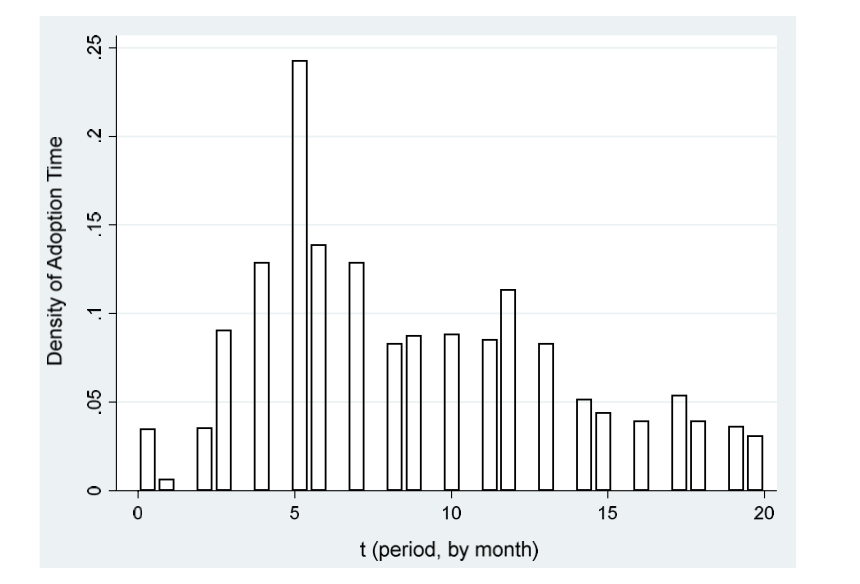 Figure 1: Histogram of the timing of algorithm adoption (t = 0: November 2015). y-axis: density of event; x-axis: month (Source: Authors)