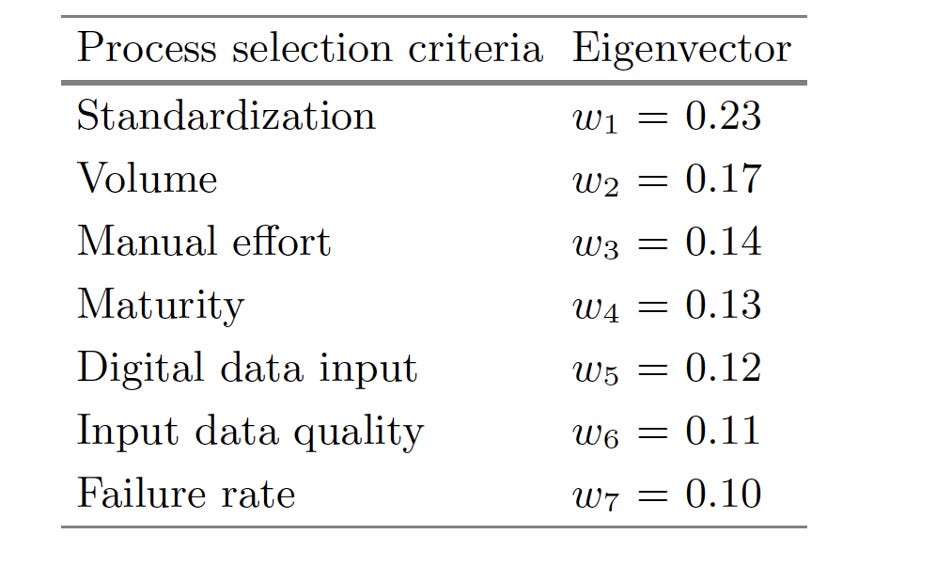 Figure 2: Process selection criteria and derived factor weights, a.k.a., eigenvectors (Source: Authors)