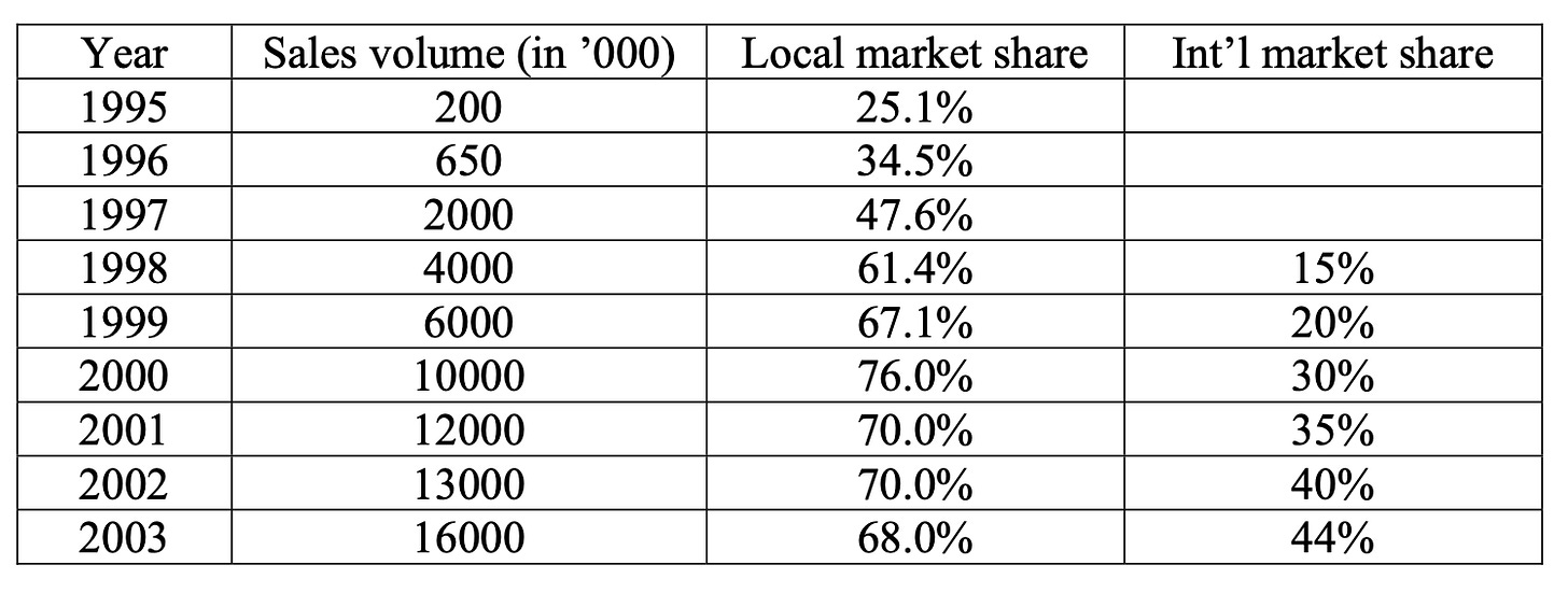 Figure 1: Galanz’s sales Information for the years 1995 – 2003 (Source: Authors)