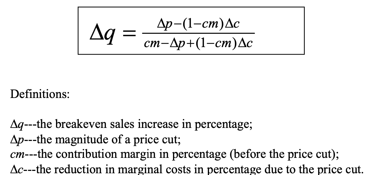Returning to the Galanz case, the company planned to reduce its average product price by about 20% (thus, Δp=20%). Galanz's average contribution margin — the contribution per unit sales before the price change (price minus marginal cost) as the percentage of the pre-change price, was about 40% (thus, cm = 40%). The expected higher sales volume should reduce unit cost by 30-40% (thus, Δc= 35%). If one enters these values into the formula, Δq = 0.905 or 90.5%. In other words, "if the demand for Galanz's products would increase by more than 90.5% as a result of the 20% price cut, Galanz would make more profit by implementing the price cut." The only question left to answer for Galanz's CEO was if the price cuts would increase sales by 100%? He bet on the positive outcome, and Galanz easily beat that number. Thus, the authors conclude, the price war "was the rational thing to do."